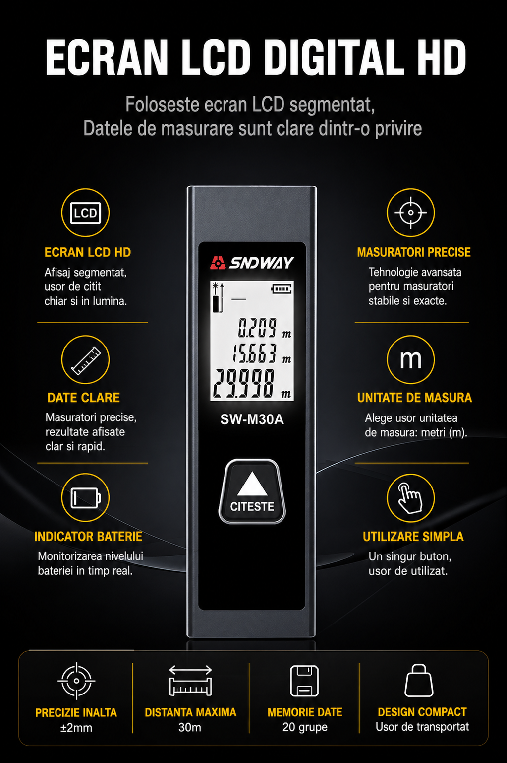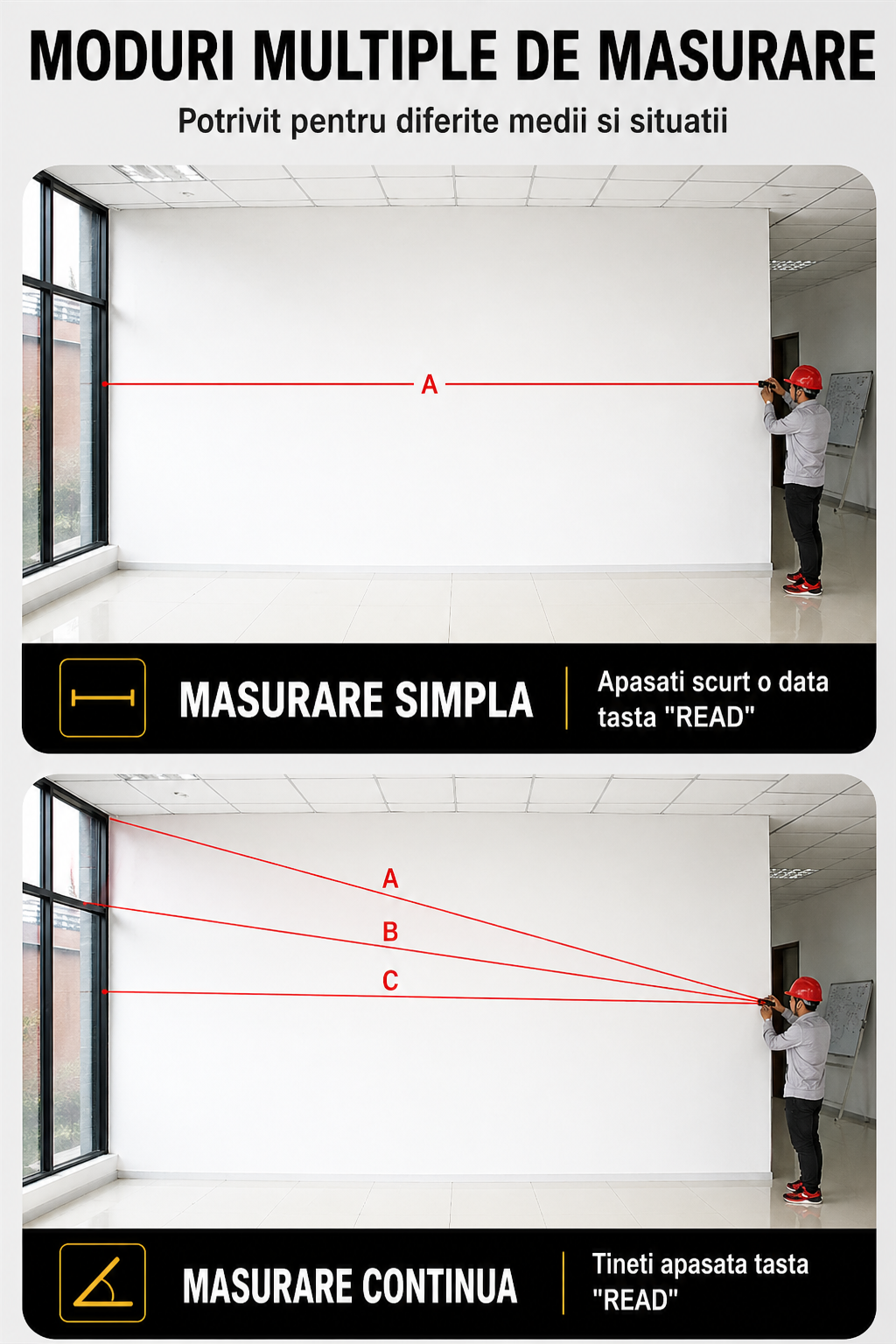 Masoara distante intre 0.05 si 30 metri, cu o precizie de ±5 mm, pentru rezultate de incredere de fiecare data.