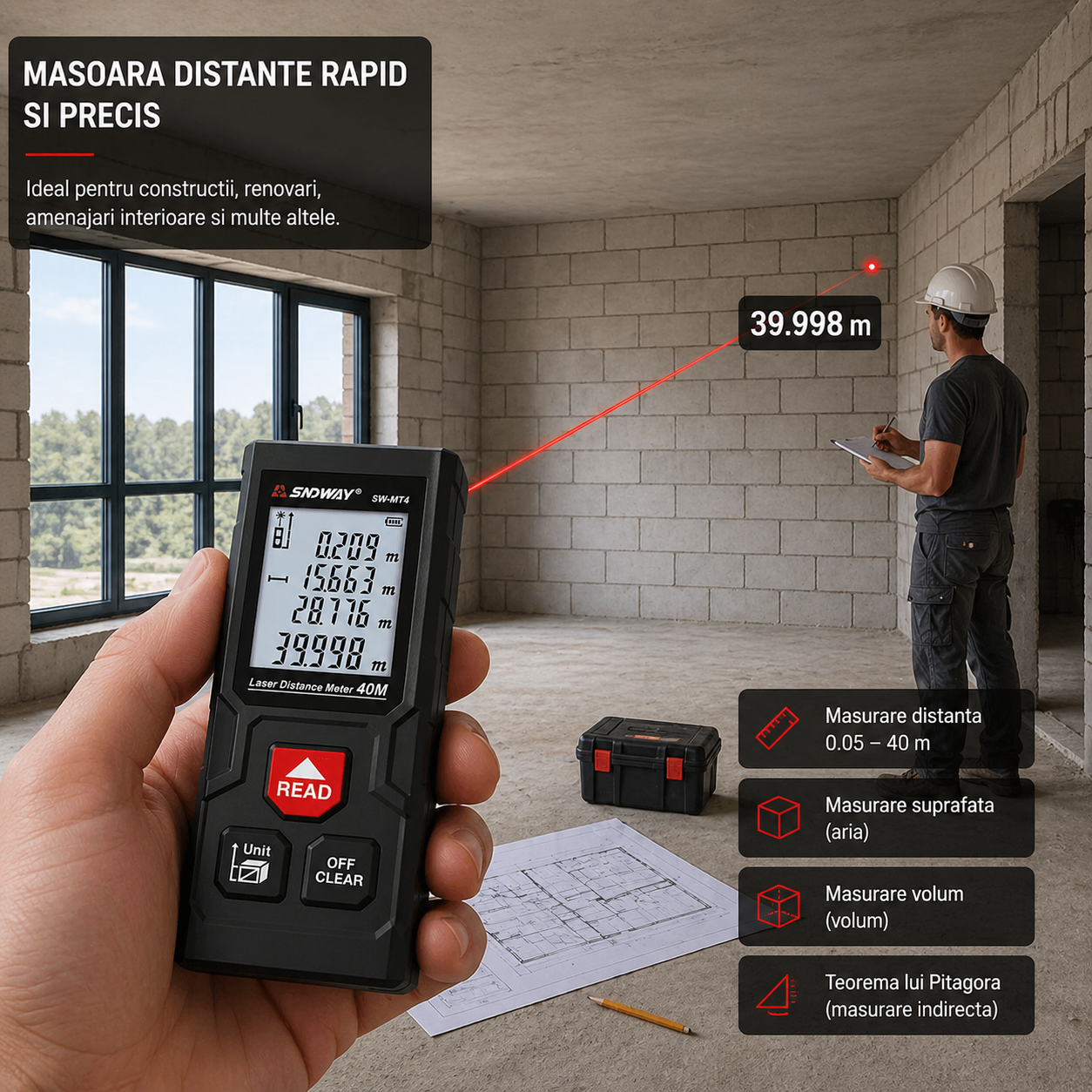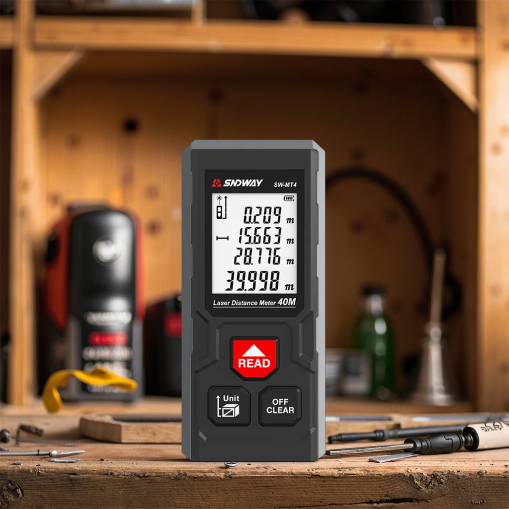 SNDWAY SW-MT4 este un telemetru laser compact si usor de utilizat, proiectat pentru masuratori rapide si precise pana la 40 metri. Ideal pentru lucrari de interior, amenajari, constructii sau proiecte DIY, acest dispozitiv ofera functii esentiale precum masurare distanta, calcul suprafata si volum, dar si functie Pitagora pentru masuratori indirecte.
